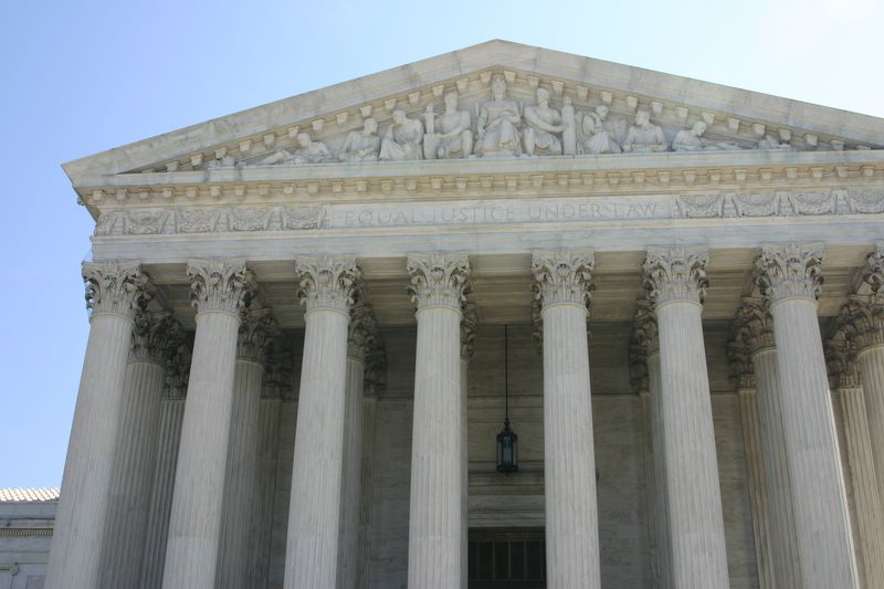 On the architrave “Equal Justice Under Law” is inscribed. The sculpture group capping the entrance represents Liberty Enthroned guarded by Order and Authority. On either side are groups of 3 figures depicting Council and Research.
